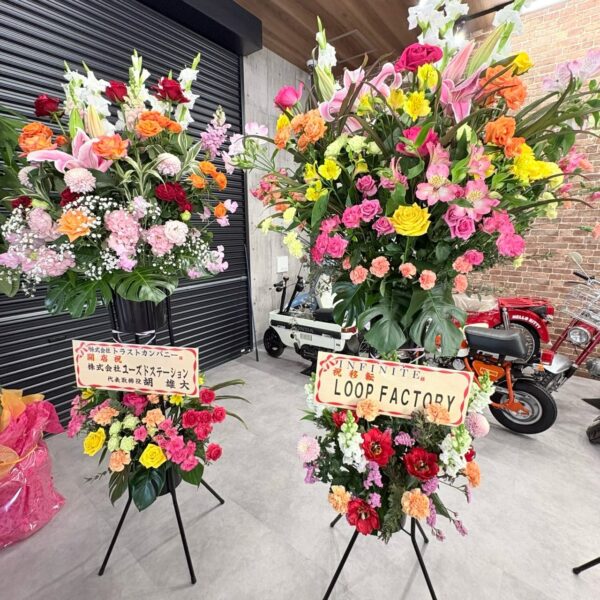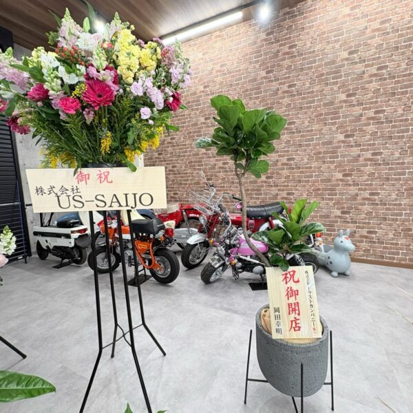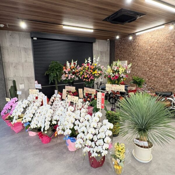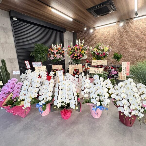 新店舗のガレージいっぱいに並んだ胡蝶蘭やスタンド花、観葉植物の数々に、スタッフ一同胸がいっぱいです。